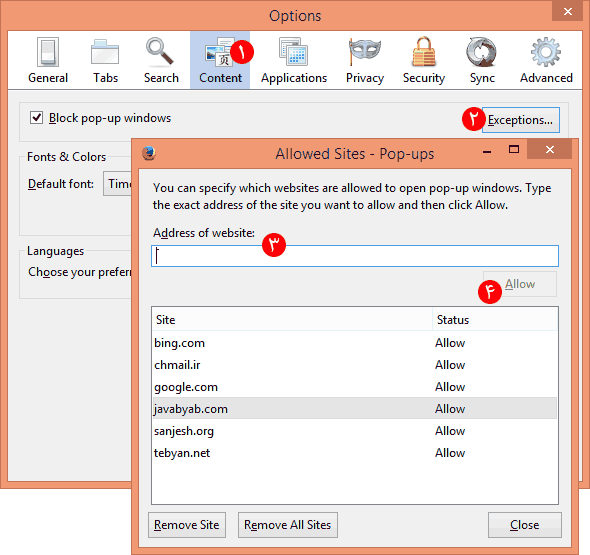 محل تنظیمات: Options > cContent > Block Pop-Up Windows > Exceptions